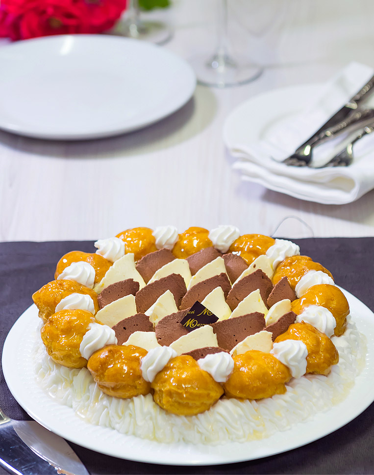 Pasta sfoglia, crema chantilly, pan di spagna, bagna al maraschino, falde di panna e panna al cacao.