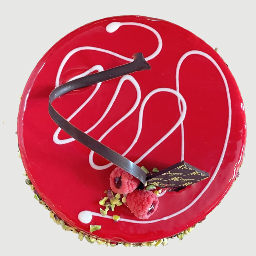 Mousse ai frutti rossi, panna cotta al cacao, bisquit di riso al cacao, granella di pistacchio, coulis di passion fruit e glassa di frutti rossi. Il dolce è disponibile solo nei mesi invernali. Dolce SENZA LATTOSIO E SENZA FARINA.